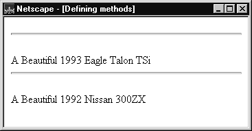 where pretty_print is the function (defined in "Functions") to display a horizontal rule and a string. Notice the use of this to refer to the object to which the method belongs.